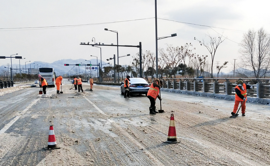 裕升、裕欣、裕祥三家養(yǎng)護(hù)公司組織綠化、保潔人員配合除雪車、裝載機(jī)等機(jī)械設(shè)備對花果山大道、黃海大道、東方大道、242省道、新光路及大浦路等主干道進(jìn)行清雪作業(yè);對程圩橋、先鋒大橋等橋面易積雪路段以及馬山路立交、新光路涵洞等“上跨下穿”路段采用撒氯化鈣的方式,加速積雪融化,并安排人員及時掃除積雪,防止路面因低溫降雪產(chǎn)生冰凍,對交通安全造成影響;對創(chuàng)智綠園廣場、火車站廣場及匝道等窗口地段采用人機(jī)結(jié)合的形式清掃積雪。盛達(dá)市政公司、瑞泰服務(wù)公司及益豐園林公司在提供鏟車、平板車、裝載機(jī)等機(jī)械車輛配合掃雪的同時,積極做好后勤服務(wù),為清雪工作有序開展提供保障。截至到中午,各條主干道積雪已基本清理完畢,道路恢復(fù)暢通,保障居民出行和交通安全。