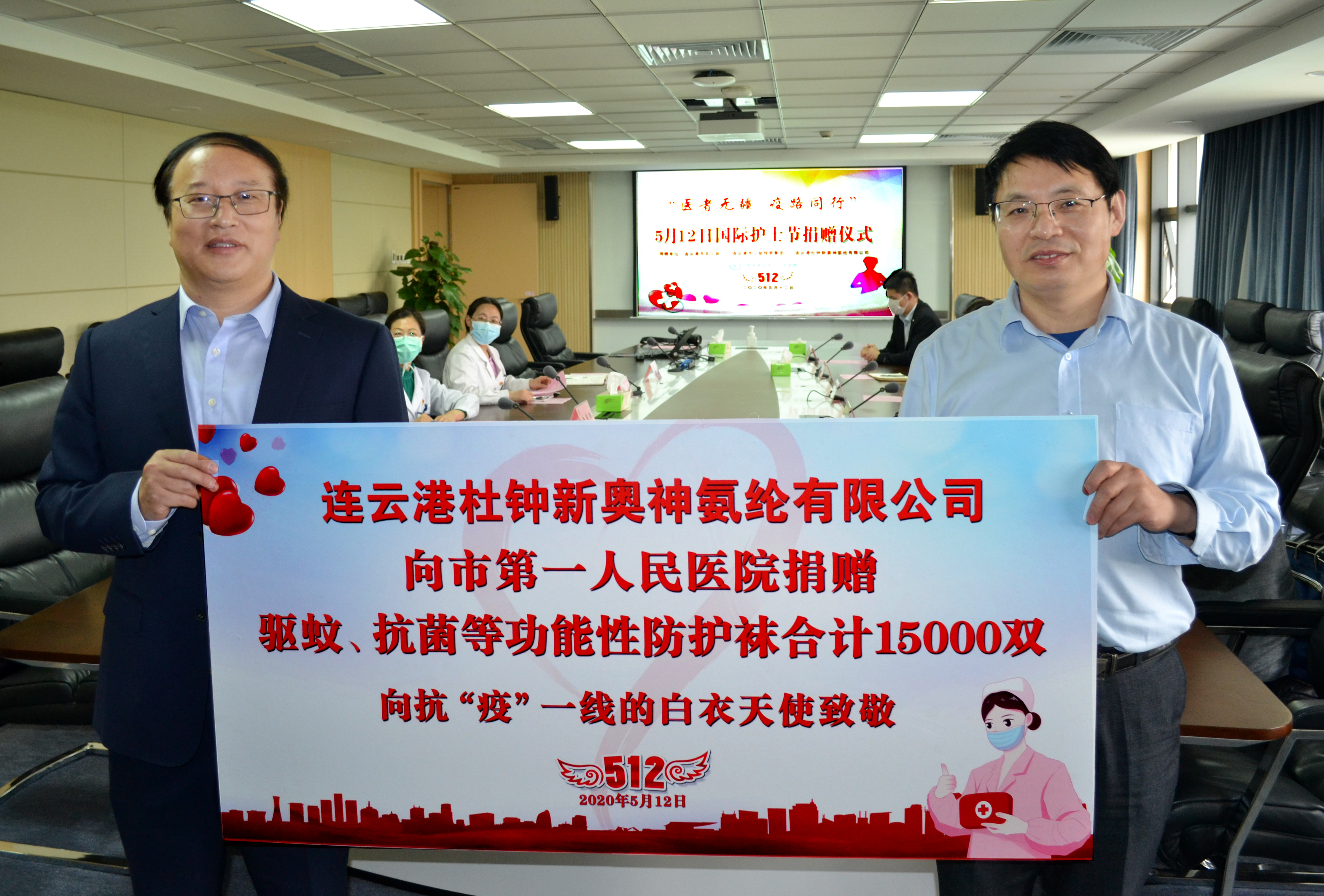 5月12日國際護士節(jié),連云港杜鐘氨綸有限公司來到連云港市第一人民醫(yī)院開展愛心捐贈活動,共計捐贈功能性絲襪15000雙。市總工會副主席秦云、集團工會主席劉承志、市一醫(yī)工會主席胡蓉,副院長李明星,氨綸公司總經理張斌出席捐贈儀式。