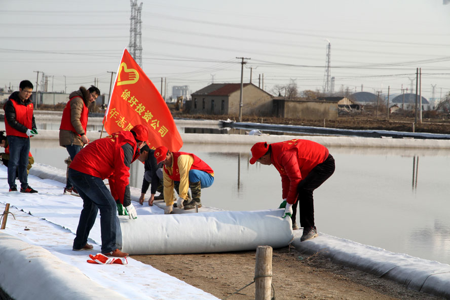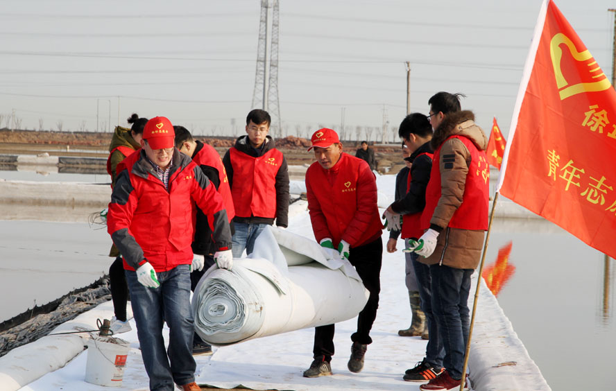 111上午,徐圩投資公司團(tuán)委組織部分青年志愿者到新灘原料鹽基地十組一單元協(xié)助完成土工布貼埝工作。