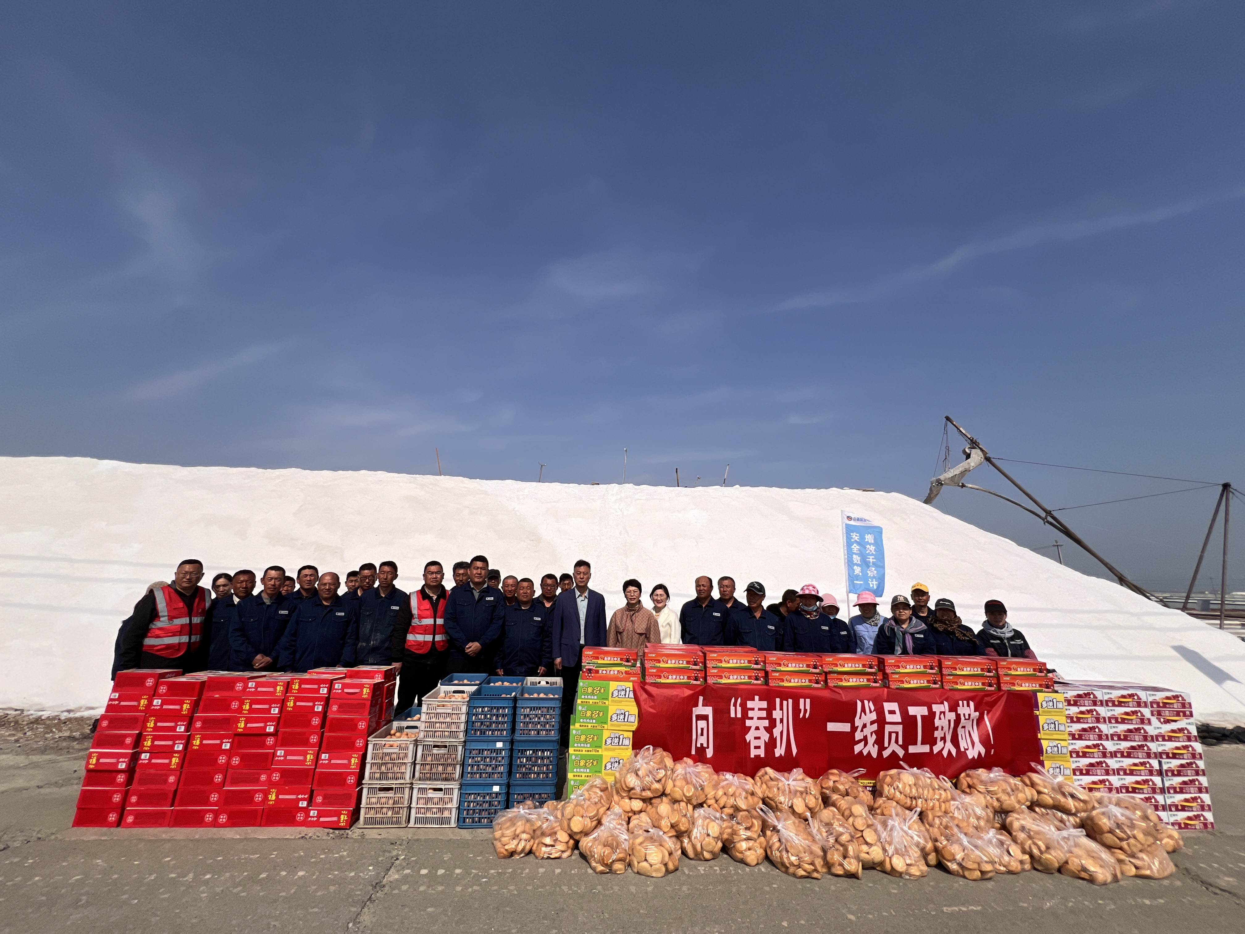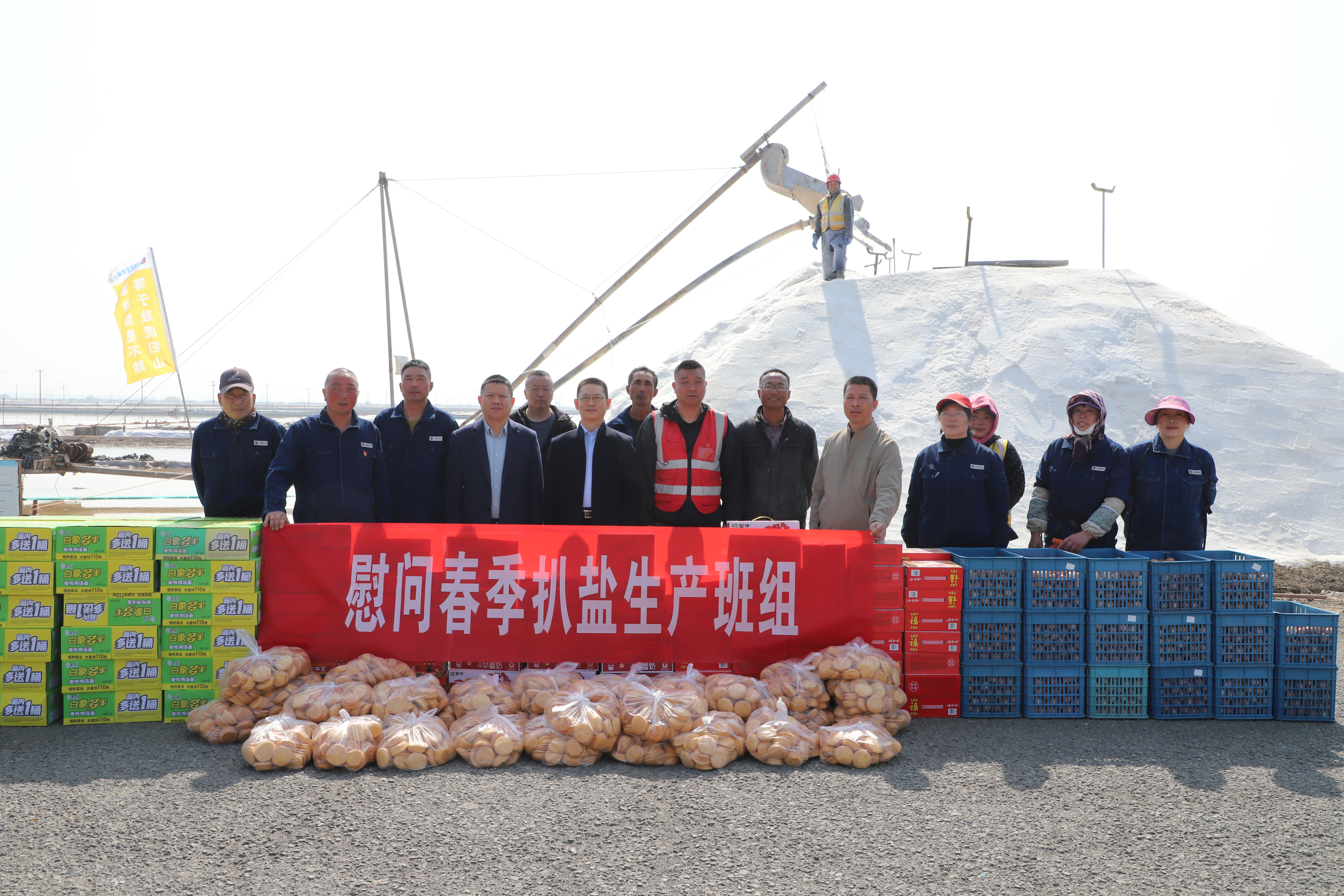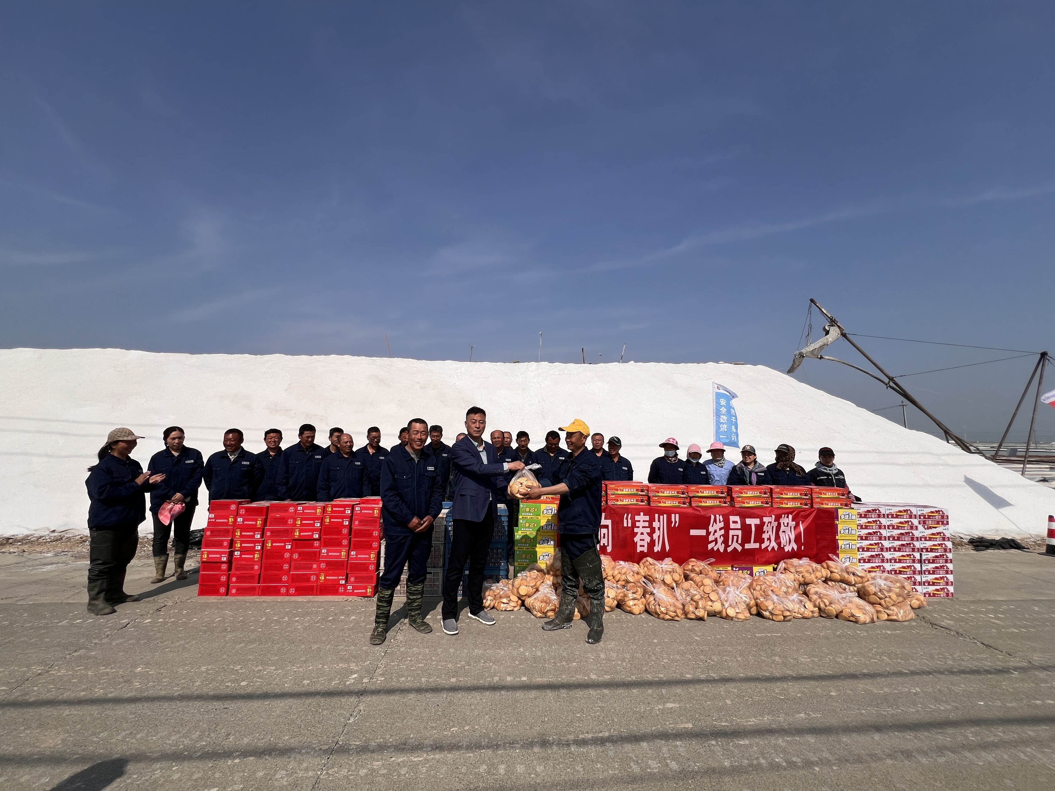 “你們辛苦了,我代表公司來看望大家?!痹谛潞邮嗯c埒南十一班,吳衛(wèi)平與扒鹽現(xiàn)場職工握手問好,感謝他們在過去的一年為日曬制鹽公司的原鹽生產(chǎn)所付出的辛勤努力,叮囑他們一定要落實落細扒鹽生產(chǎn)措施,增強責任感和警覺性,嚴格執(zhí)行各項規(guī)章制度,切實保障扒鹽期間的安全生產(chǎn),并送上雞蛋、八寶粥、方便面、牛奶等物品。