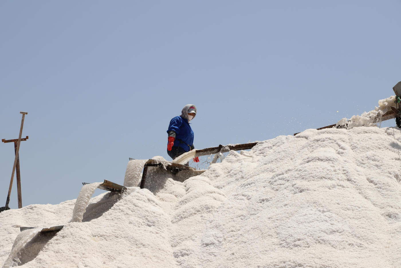 在新河十一班,扒鹽工作正在緊張的進(jìn)行之中,兩名員工在鹽廩上揮舞著木鍬,搬送著淌鹽的導(dǎo)流板做鹽廩,扒鹽員工跟時(shí)間賽跑,24小時(shí)不停機(jī)3班倒開機(jī)扒鹽,緊緊抓住當(dāng)前生產(chǎn)經(jīng)營的黃金季節(jié),搶抓扒鹽進(jìn)度,堅(jiān)決實(shí)現(xiàn)時(shí)間任務(wù)雙過半。