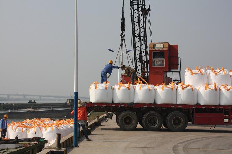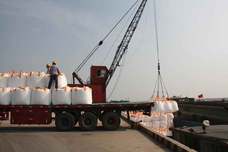 4月30日上午9時許,隨著一聲汽車長笛,一輛載有近40噸化工物資的卡車徐徐??吭谙笪锪鞴疚骞嗪哟a頭邊,緊接著碼頭鐵臂起舞,機械操作工嫻熟地操縱著塔吊機械,準確地將一包包噸貸物資裝卸在碼頭邊的貨船中。。。。。。自此,一輛輛滿載40余噸貨物的卡車源源不斷向碼頭駛來。