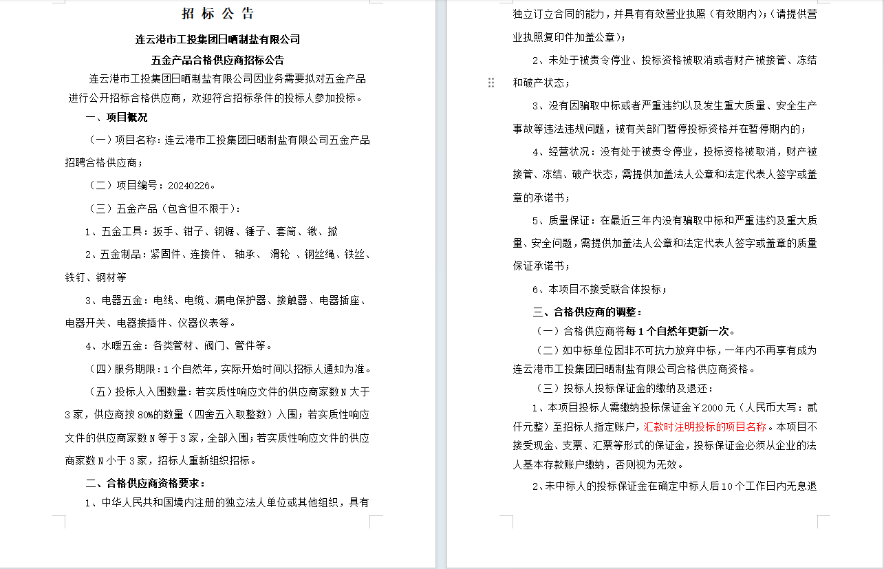 連云港市工投集團(tuán)日曬制鹽有限公司五金產(chǎn)品合格供應(yīng)商招標(biāo)公告