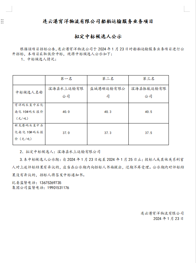 連云港宵洋物流有限公司船舶運(yùn)輸服務(wù)業(yè)務(wù)項目擬定中標(biāo)候選人公示