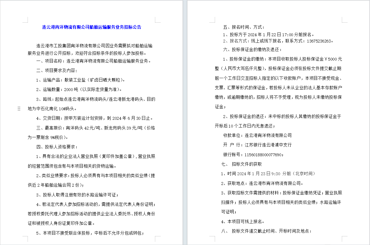 連云港宵洋物流有限公司船舶運輸服務業(yè)務招標公告
