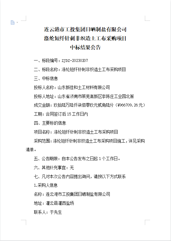連云港市工投集團日曬制鹽有限公司滌綸短纖針刺非織造土工布采購項目中標(biāo)結(jié)果公告