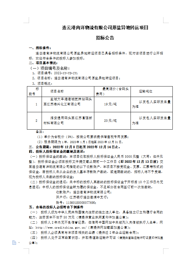 連云港宵洋物流有限公司原鹽異地轉(zhuǎn)運項目招標(biāo)公告