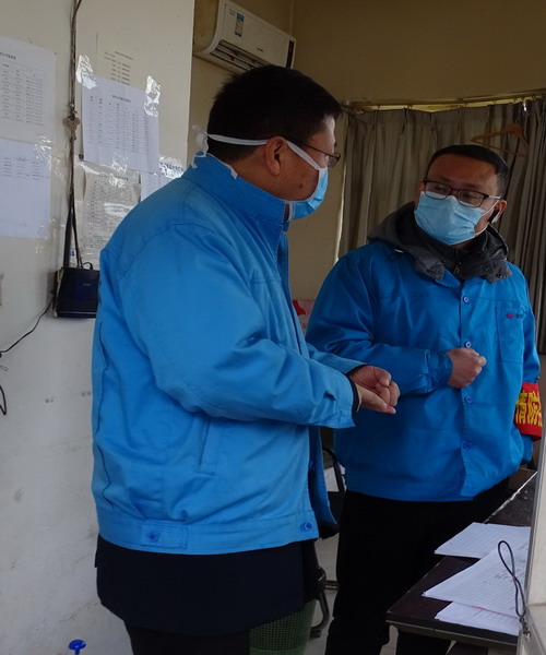 李忠祥檢查門衛(wèi)進(jìn)場人員測體溫情況(左一)