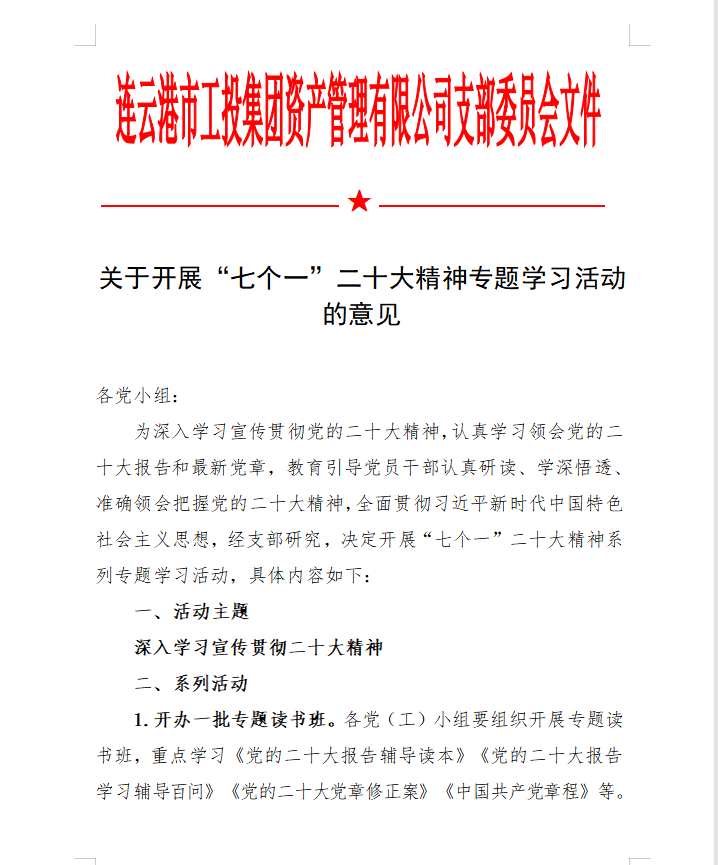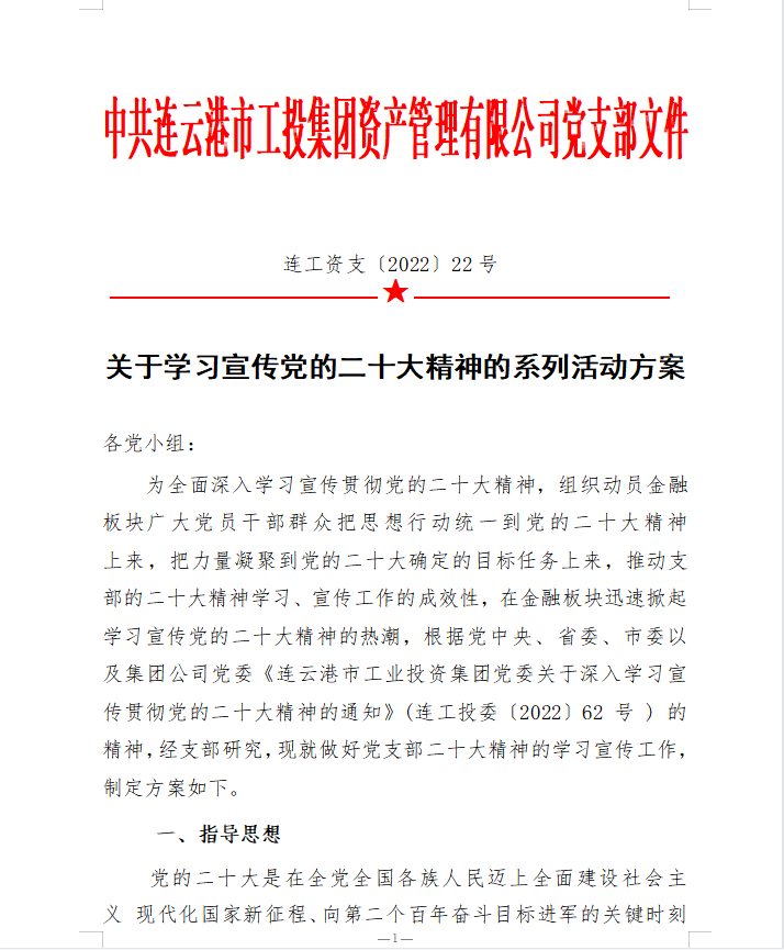 為在金融板塊快速掀起學(xué)習(xí)宣貫黨的二十大精神熱潮,支部精心組織、積極籌劃,完善學(xué)習(xí)方案,創(chuàng)新學(xué)習(xí)教育形式,豐富黨建活動載體,支部結(jié)合公司實際,專門制定《學(xué)習(xí)宣傳貫徹二十大精神學(xué)習(xí)方案》、《關(guān)于開展“七個一”二十大精神專題學(xué)習(xí)活動的意見》。