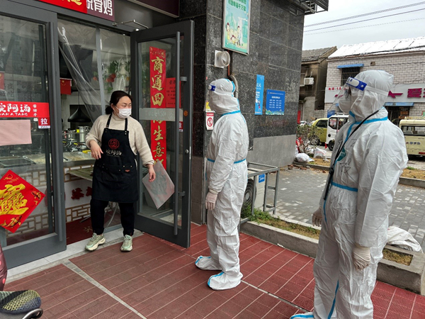 公司員工范益楊、李夢(mèng)達(dá)是集團(tuán)抗疫志愿隊(duì)的隊(duì)員。在冷冽寒風(fēng)中,他倆身穿防護(hù)服挨家挨戶(hù)通知商戶(hù)暫停營(yíng)業(yè),同樣的通知話(huà)語(yǔ)不厭其煩的重復(fù)著一遍又一遍,說(shuō)得口干舌燥、疲憊不堪也未能阻攔他們繼續(xù)前進(jìn)的腳步。