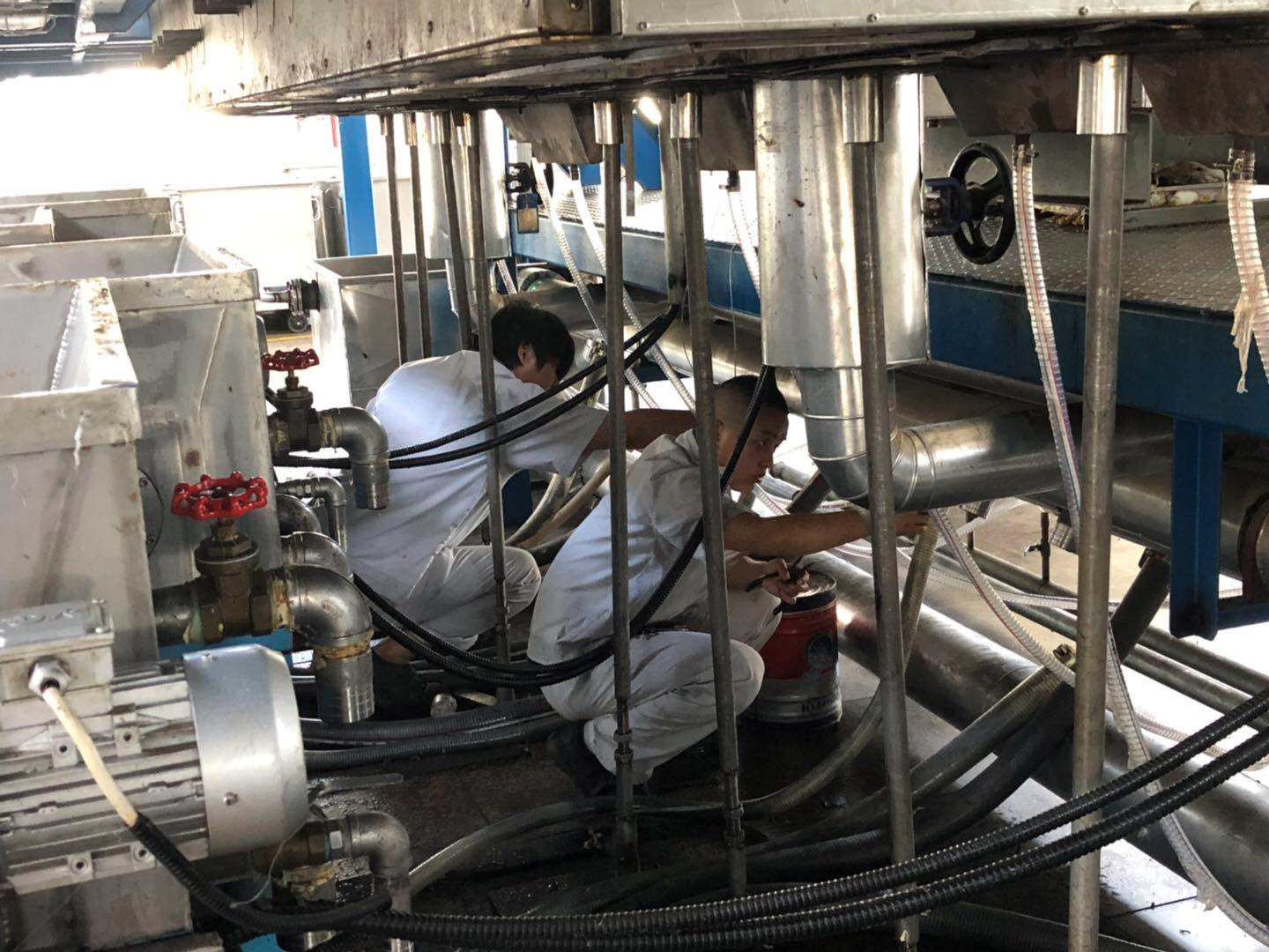 開展生產(chǎn)線設(shè)備清理工作。后紡員工無懼炎熱天氣,擼起袖子加油干,面臨萃取機內(nèi)部空間狹小難清理難題時,身材精瘦的員工爭相進入萃取機內(nèi)部進行清理作業(yè),形成“愛企奉獻”工作氛圍。