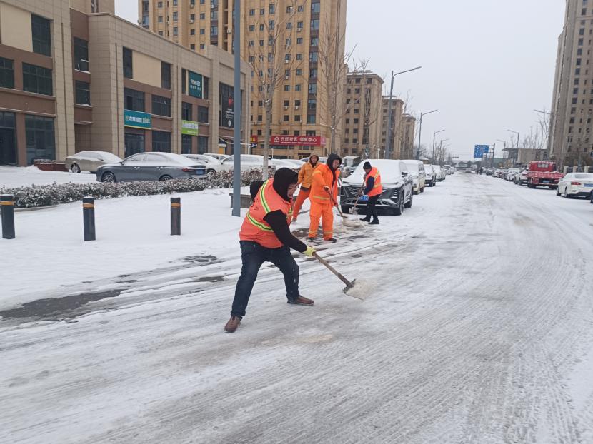 5日凌晨4點,該公司負責人于廣華已經(jīng)在除雪的第一線,積極安排工作調(diào)度,對新光路、平山路、黃海大道等重要路段突擊清掃,大家頂著風雪,齊心協(xié)力,分工明確,高效配合,全力清除路面上的積雪和暗冰,及時為車輛和行人清理出一條條“安全路”。