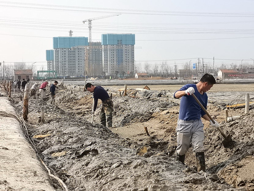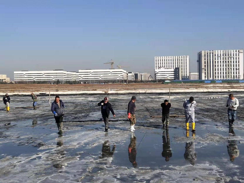 礦鹽復(fù)產(chǎn)項(xiàng)目部,聘請日曬制鹽專家王緒前進(jìn)行工藝指導(dǎo),聘請勞模朱春年帶領(lǐng)團(tuán)隊(duì)攻堅(jiān)。復(fù)產(chǎn)戰(zhàn)役從2021年12月就打響了,春節(jié)的時(shí)候,他們僅休了三天假,大年初三全部到崗,一鍬一鍬挖泥通溝,一條一條池堰加高整平,一塊一塊鹽田清理壓實(shí)......到2月,他們硬是把征地后廢棄許久的鹽田和邊角地整理成礦鹽基地,結(jié)晶池面積達(dá)1950公畝,達(dá)產(chǎn)可產(chǎn)原鹽20000噸。