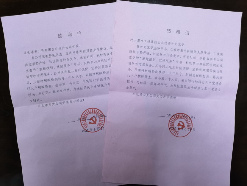 “臺北投資公司的黨員同志們視疫情防控為己任,服從調(diào)度安排,站好每一班崗,不僅認(rèn)真履行防控職責(zé),又創(chuàng)新開展疫情防控教育宣傳、便民服務(wù)等多項(xiàng)活動(dòng),成為我們社區(qū)防疫攻堅(jiān)的主力軍。”3月25日,收到開發(fā)區(qū)猴嘴街道昌圩社區(qū)送來的一份特殊的“禮物”— 一封疫情防控感謝信,感謝臺北投資公司黨員蘇玲、孫芳等同志在新冠肺炎疫情防控的關(guān)鍵階段挺身而出、伸出援手,參與協(xié)助社區(qū)的疫情防控工作。