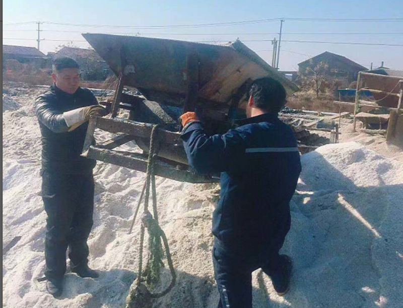 在海洲灣公司的海濱三組原鹽集運(yùn)現(xiàn)場(chǎng),過河原鹽皮帶機(jī)滾籠上的鋼筋因機(jī)械疲勞斷裂造成無法運(yùn)轉(zhuǎn)。為了不影響原鹽集運(yùn),接到通知后,機(jī)械班維修人員冒著刺骨嚴(yán)寒迅速攜帶電焊機(jī)等維修工具趕到現(xiàn)場(chǎng)。露天下,檢查拆卸、焊接加固、安裝調(diào)試一氣呵成,很快機(jī)械又重新運(yùn)轉(zhuǎn)起來。