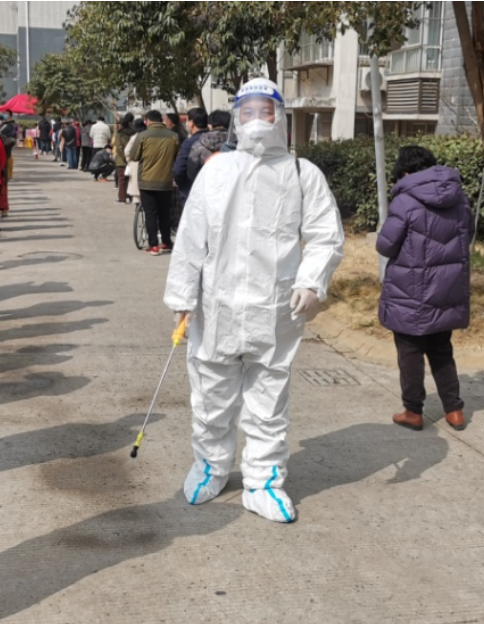 ? ?黨員尹永明,穿好防護(hù)服,帶上手套,口罩和防護(hù)眼鏡,背上30多斤的便攜式噴射器全身“武裝”,變成“大白”開始了一天的工作,從早上7點開始“打起精神努力干”到下午1:30“拖著疲憊的雙腿結(jié)束”。