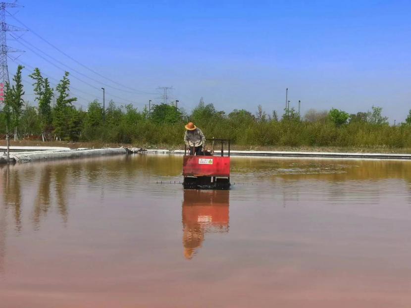 在原鹽生產(chǎn)中有一道重要的工序叫“活碴”,就是把結(jié)晶池中的鹽進行翻動,翻動后有利于鹽晶面生長,增加鹵水與鹽晶體的接觸面積,提高原鹽產(chǎn)量。每日清晨6點半,礦鹽班組準時有一名工人駕駛活碴機,對鹽池板進行破碎翻動,保持鹽層的疏松和顆粒間一定的間隙,確保晶體長得既快又好。