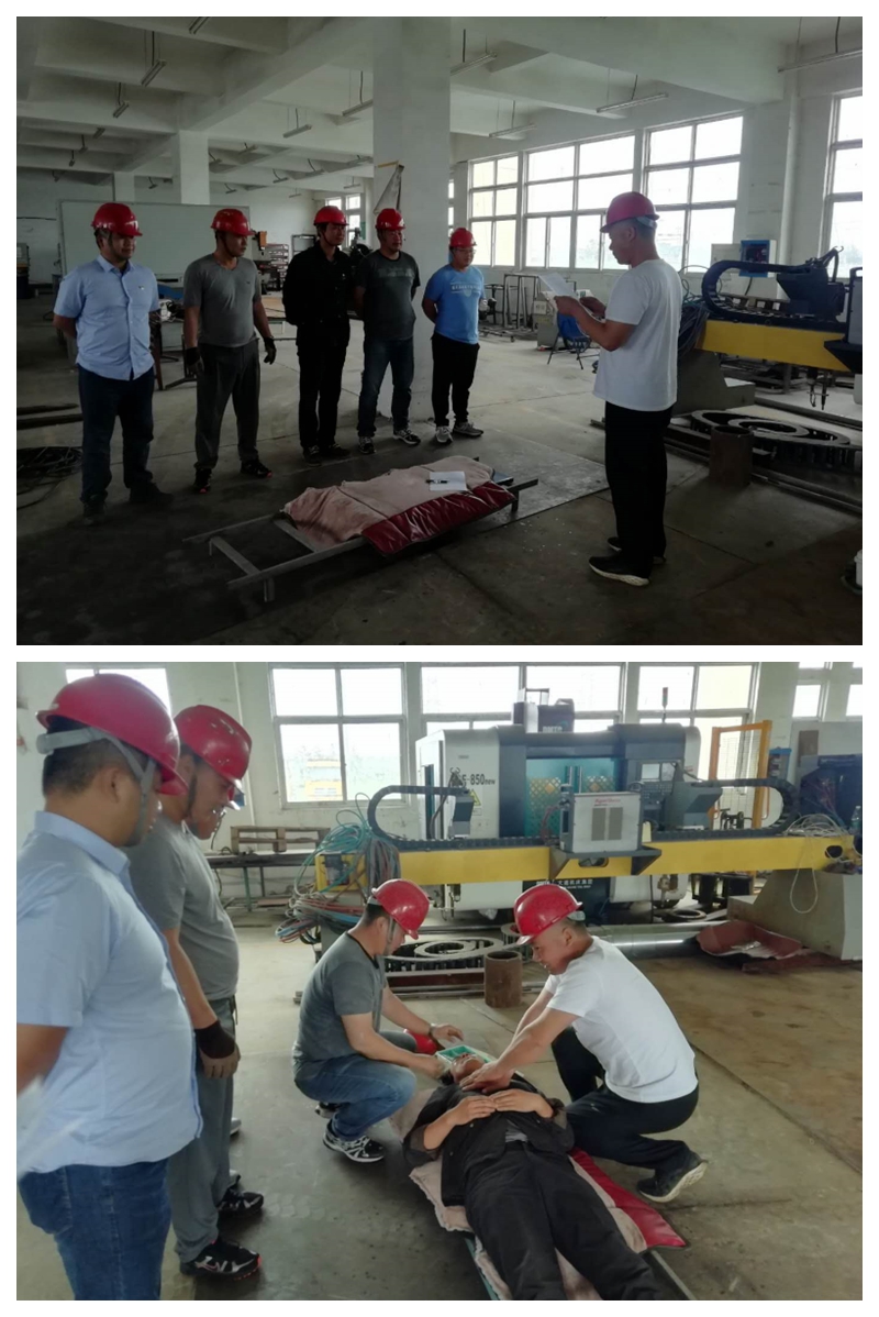 本次演練方案模擬在精工車間正常生產(chǎn)過程中,因?qū)﹄姎庠O(shè)備沒有經(jīng)常性檢查,液壓切板機切板時掉落的鋼板未采取防范措施將電氣電纜砸斷搭鐵,造成液壓切板機金屬外殼帶電,作業(yè)人員在正常操作機床時造成觸電事故傷害。當同事發(fā)現(xiàn)有人觸電后,立刻做出救援反應(yīng),切斷電源將觸電人員安全隔離開后抬到擔架上進行搶救。并同時上報應(yīng)救援指揮組,指揮組迅速做出響應(yīng),啟動防觸電應(yīng)急預(yù)案,大家按應(yīng)急預(yù)案的分工迅速開展救援工作,撥打120急救電話、拉警戒線、查看傷情、緊急搶救、人工心肺復(fù)蘇等,直至觸電者蘇醒,在大家的共同協(xié)作下演練圓滿成功,翔立分公司湯占國總經(jīng)理對此次演練效果進行了總結(jié)和點評。